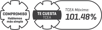 Ejemplo: TCEA máxima referencial considerando TEA de 83.40% para un préstamo de S/5,000 a 12 meses, 35 días de periodo de gracia. Cuota mensual: S/606.19.Total, intereses: S/2029.01 que incluye al Seguro de Desgravamen mensual de 0.6601% conforme al tarifario vigente. Opcional: Seguro de Desgravamen mensual con rescate o devolución es 1.0884%. Ante el incumplimiento del pago según las condiciones pactadas, se cobrará un interés moratorio de acuerdo al tarifario vigente.